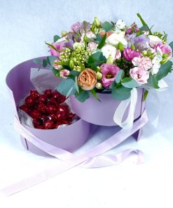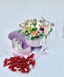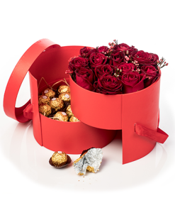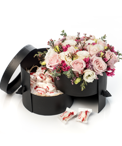 קופסה נפתחת שזורה בוורדים ורודים ושוקולדים טעימים כ250 גר