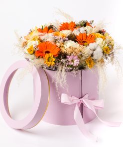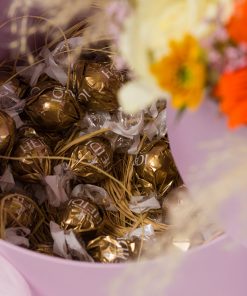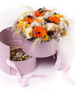 סידור פרחים בסגנון הבוהו שיק. קוטר הקופסא 25 ס"מ. 150 גר' שוקולד