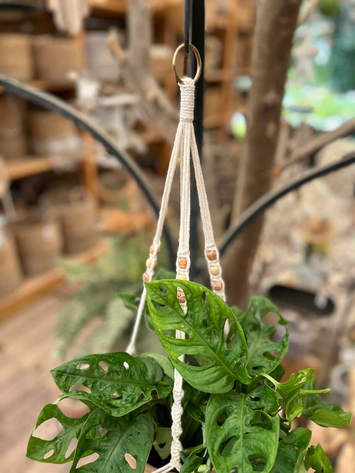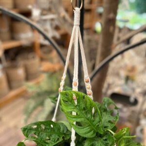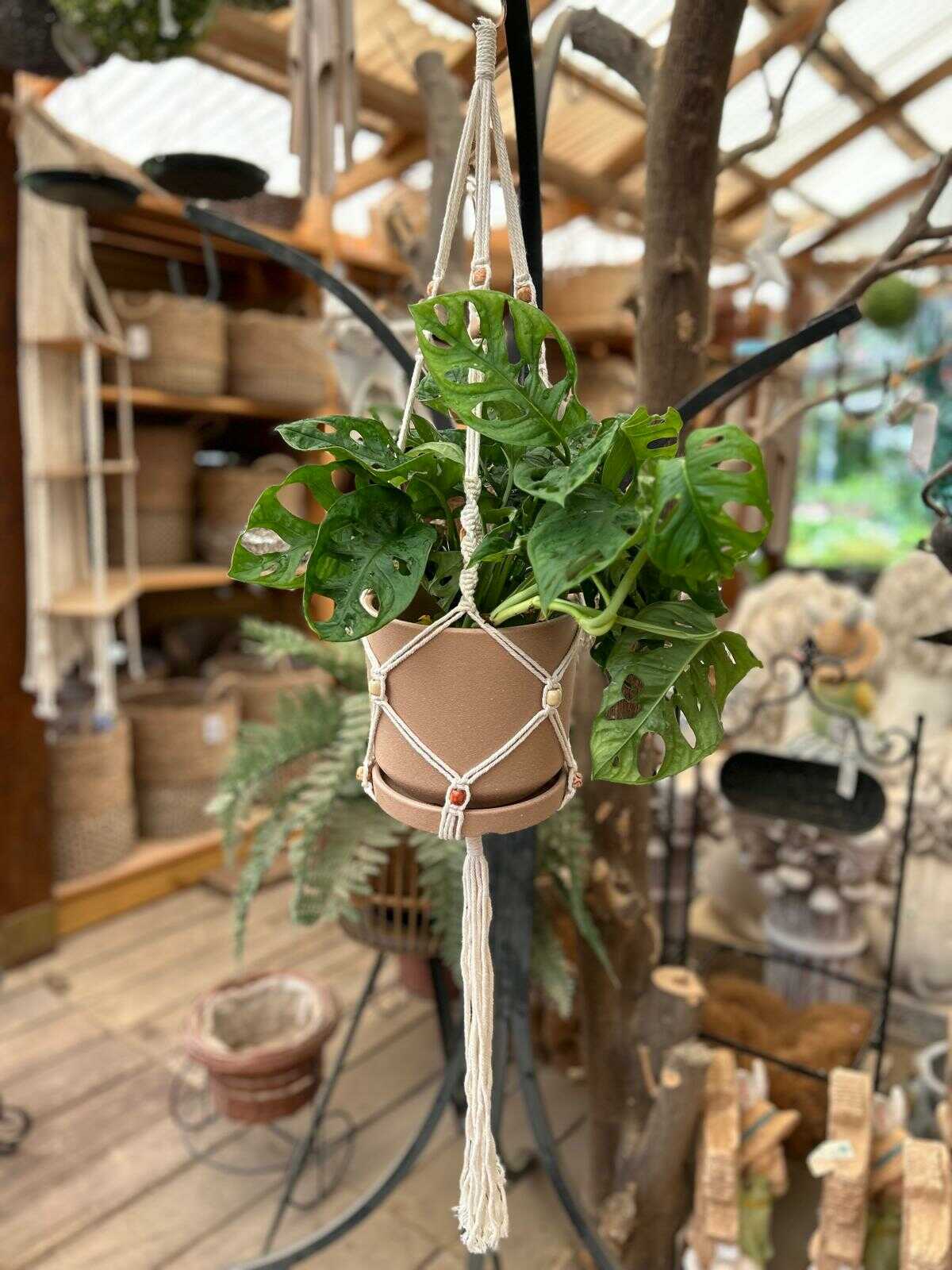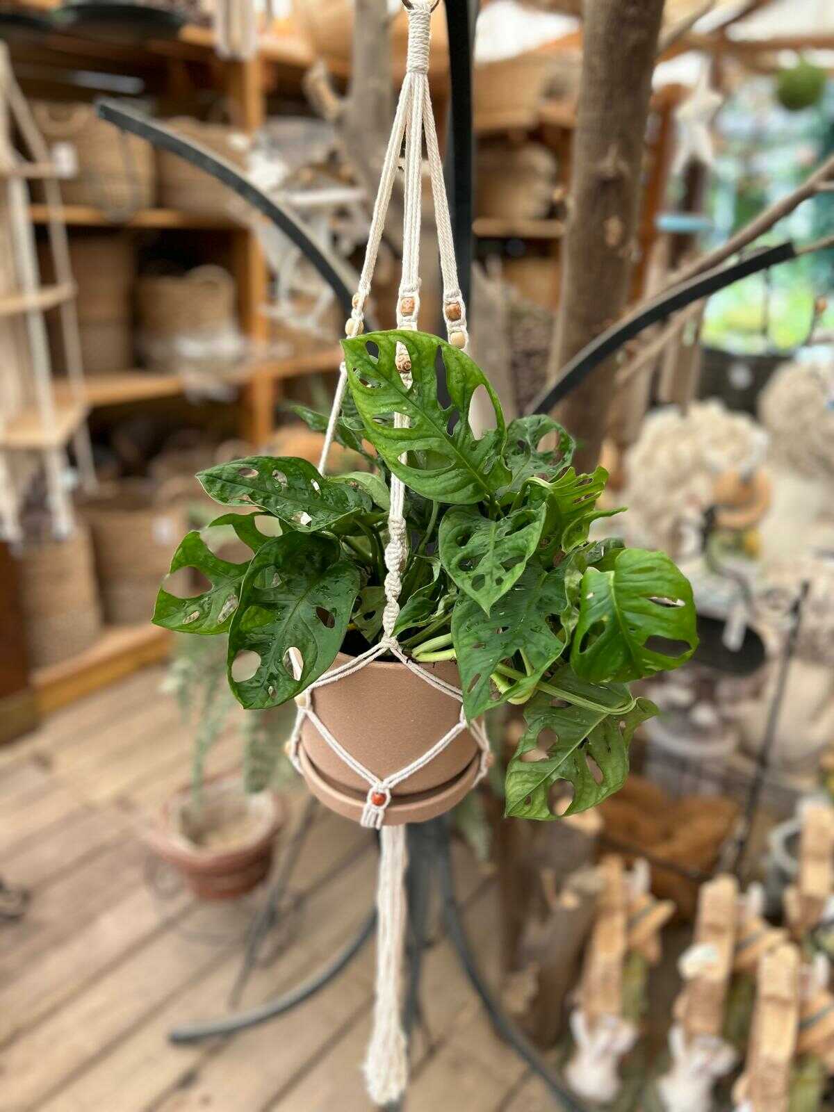 מונסטרה מנקי שתולה בעציץ קרמיקה, במתלה מקרמה.