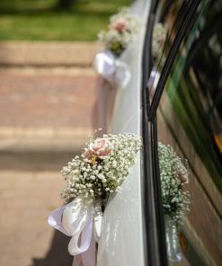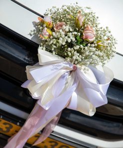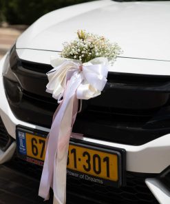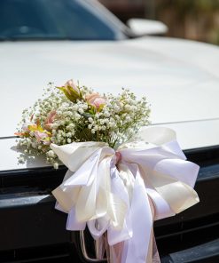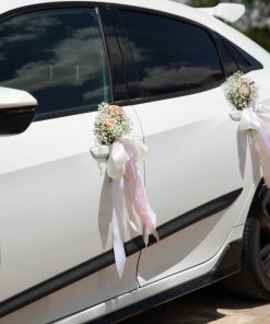 הסידור האלגנטי שלנו, מחמיא לכל רכב, כאשר ידיות הרכב מעוטרות באגד של גיבסנית לבנה וורדים רומנטיים בשובל סרטי משי.