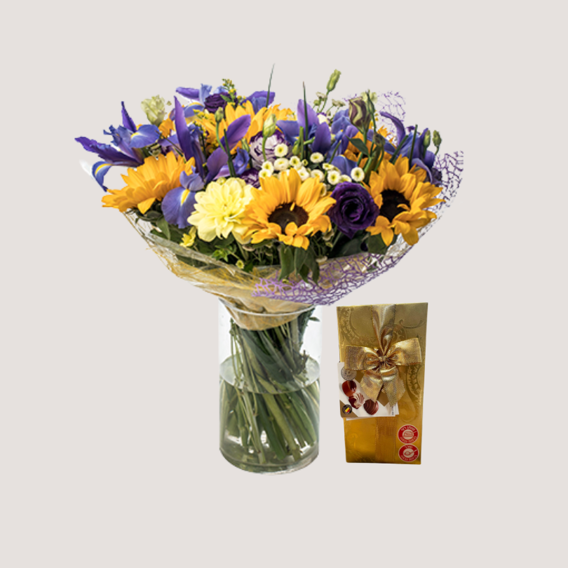 זר עם חמניות ואירוסים – סמל למלכותיות, חוכמה וזוהר טבעי. (ללא וואזה)