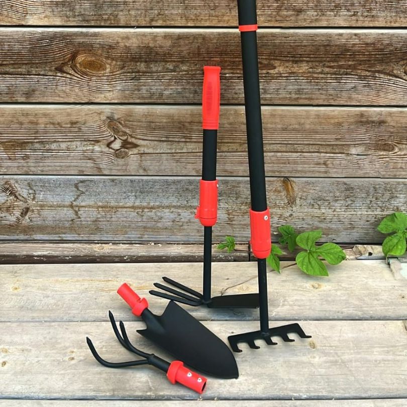 סט כלי עבודה ידניים לגינה 6 חלקים- כף חפירה, מקלטר, מעדר משולב, מגרפה, ידית אחיזה ומוט טלסקופי עד 80 ס"מ.