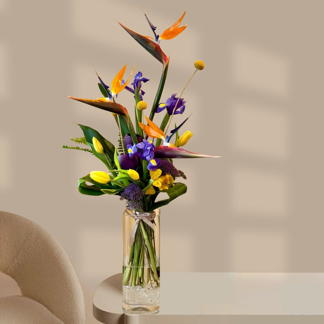 זר שמבשר את בוא החורף בשילוב ציפור גן עדן, אירוסים וצבעוני