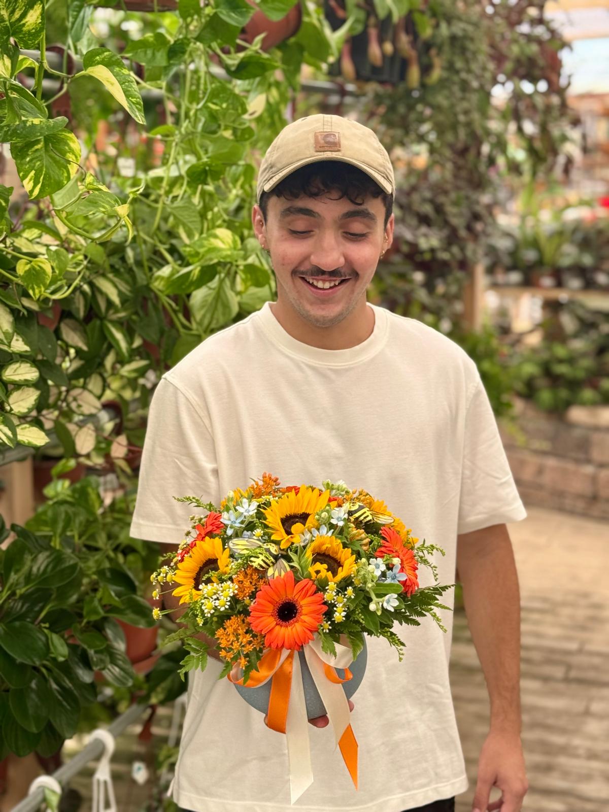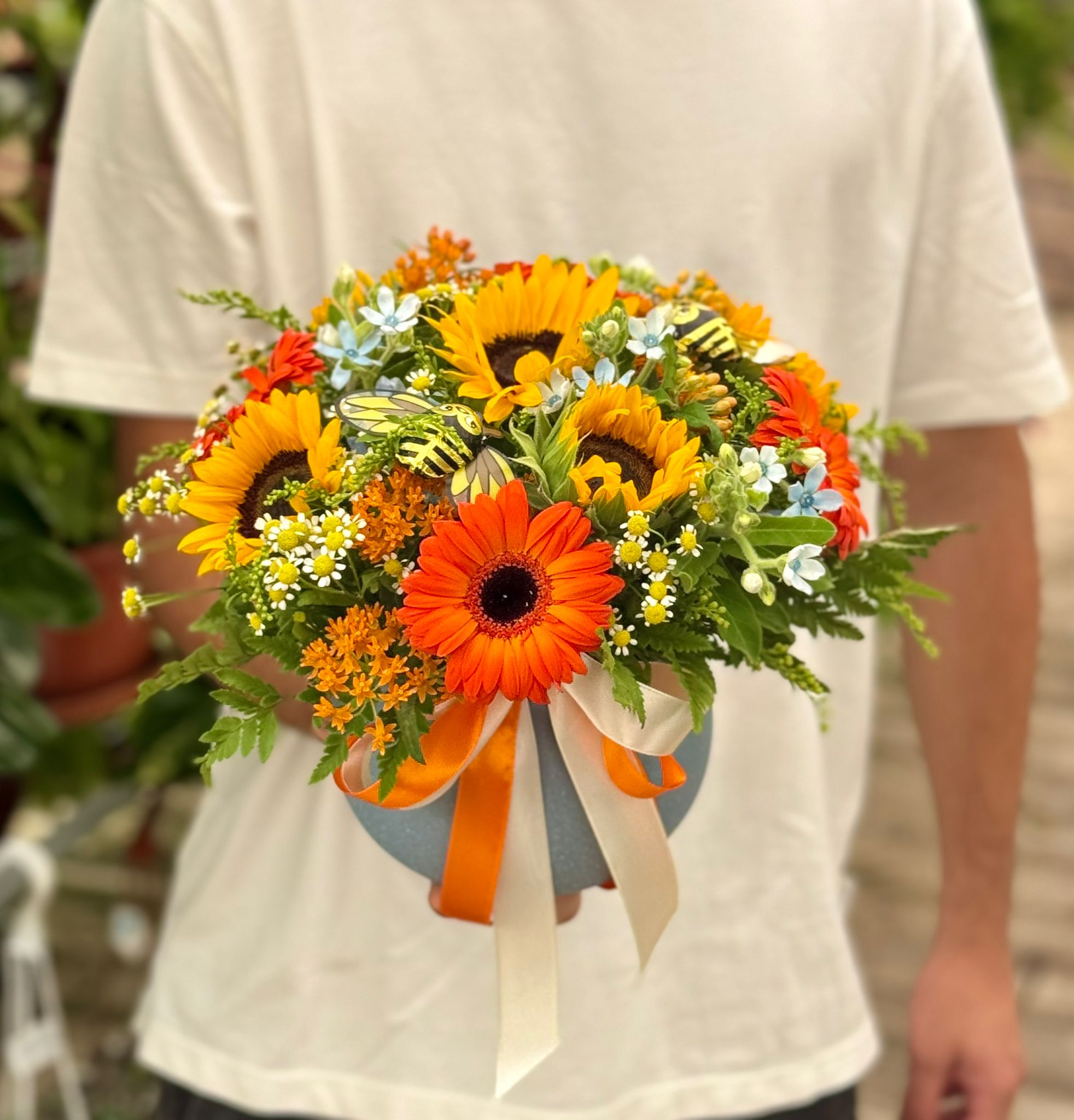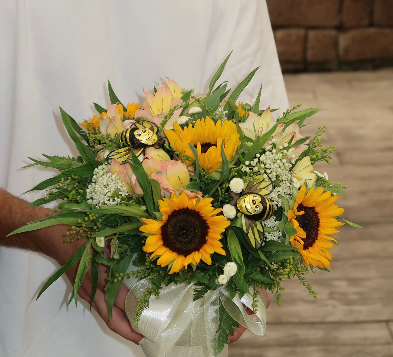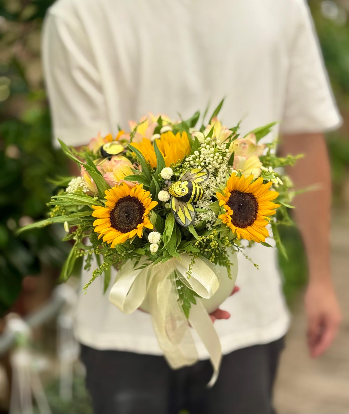 מושלם להניח במרכז השולחן או להעניק כמתנה. משולב עם דבורים משוקולד באווירת החג. רוחב הסידור כ30 ס"מ, גובהו כ25 ס"מ.
