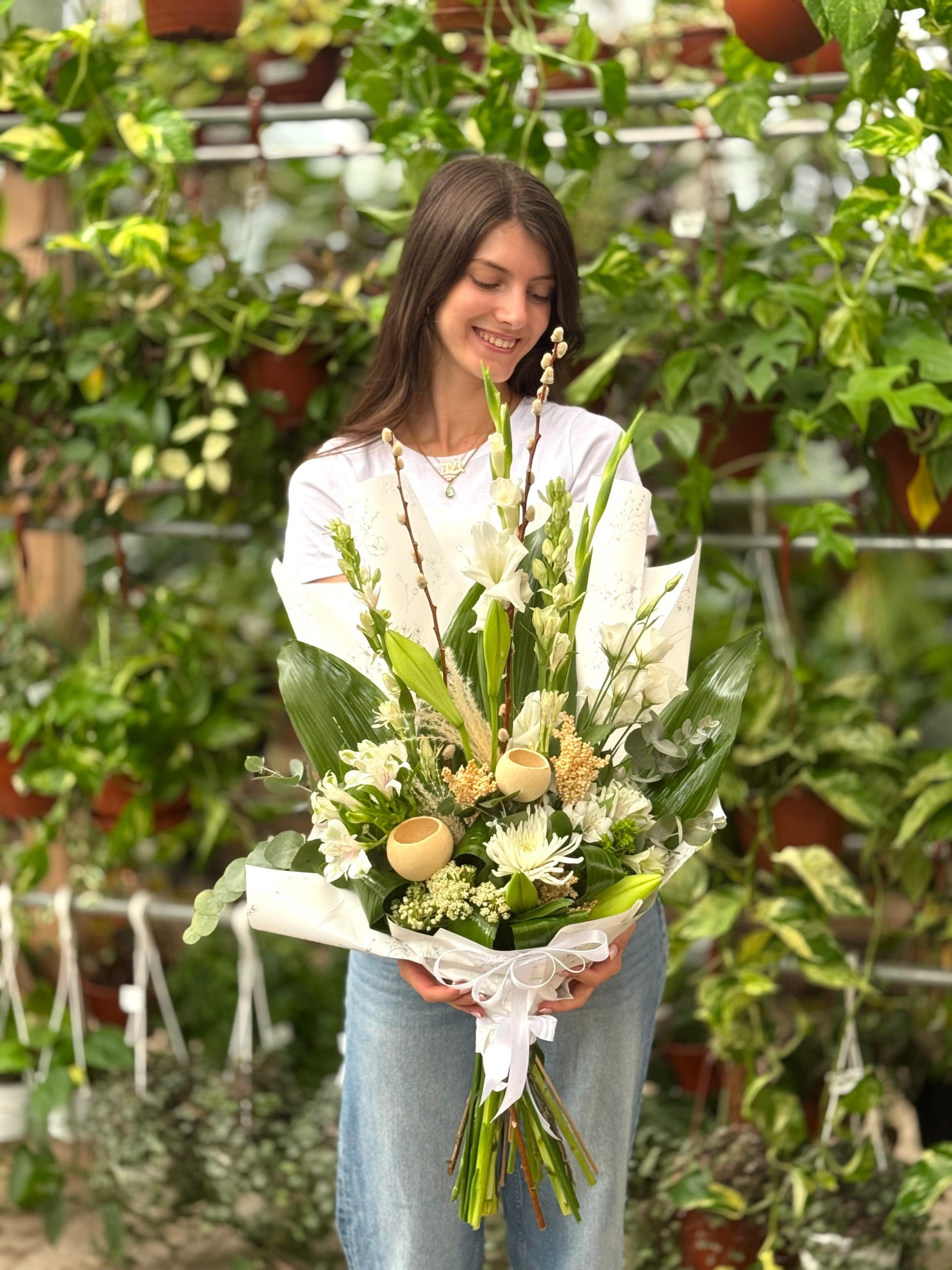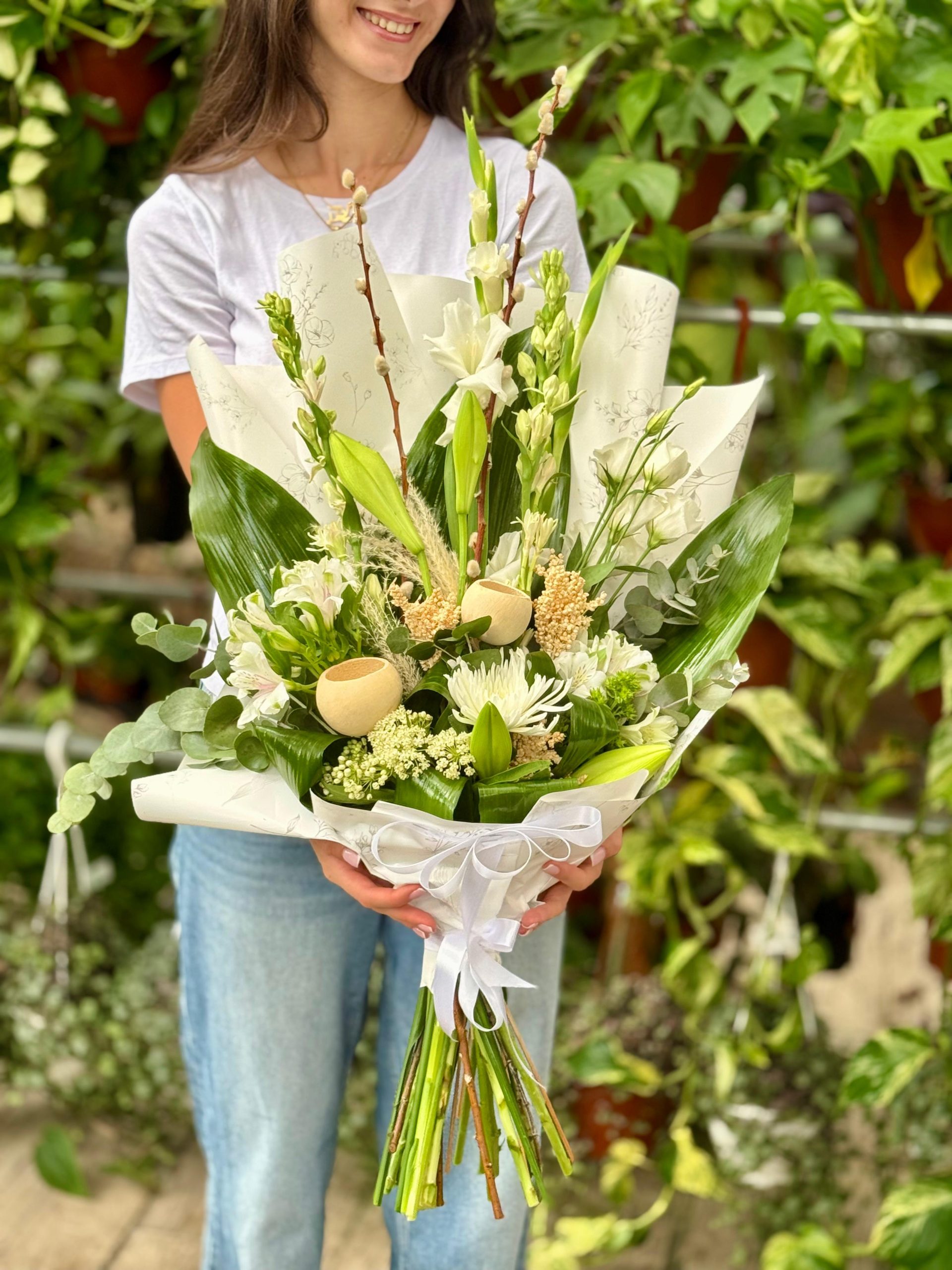 זר גברתי הנאווה – זר פרונטלי חגיגי ומלא אלגנטיות, המשלב פרחים בגוונים לבנים רכים לצד ירק עשיר ומעודן. הקונטרסט בין הלבן הנקי לירוק המרענן יוצר מראה קלאסי, יוקרתי ועם נוכחות מרשימה – מושלם לכל אירוע חגיגי או מתנה מיוחדת
