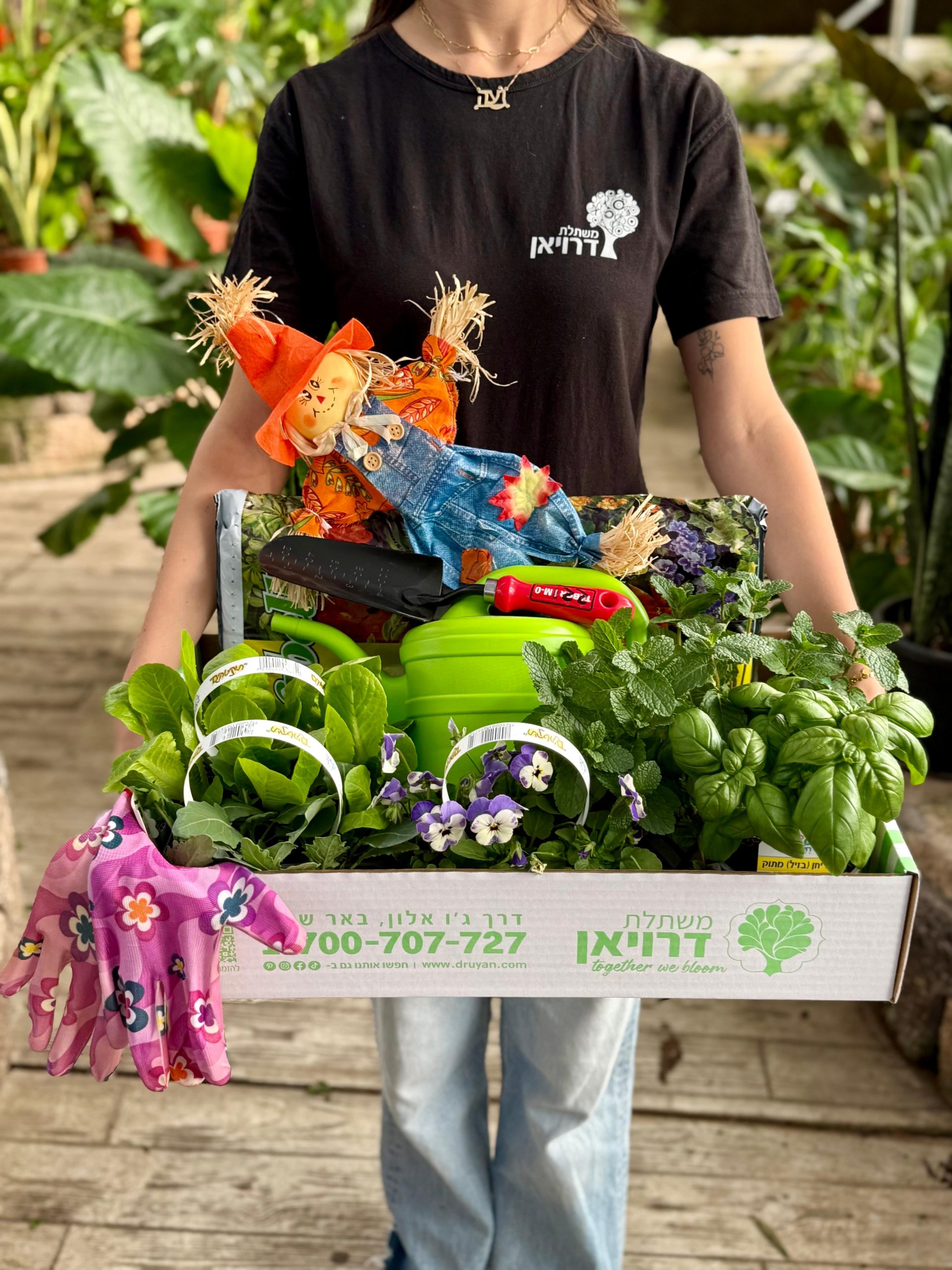 מארז כולל: תערובת שתילה 10 ליטר, דחליל, כף שתילה, משפך 3 ליטר, כפפות, 2 תבלינים, שישיה פורחת ו2 שישיות ירקות