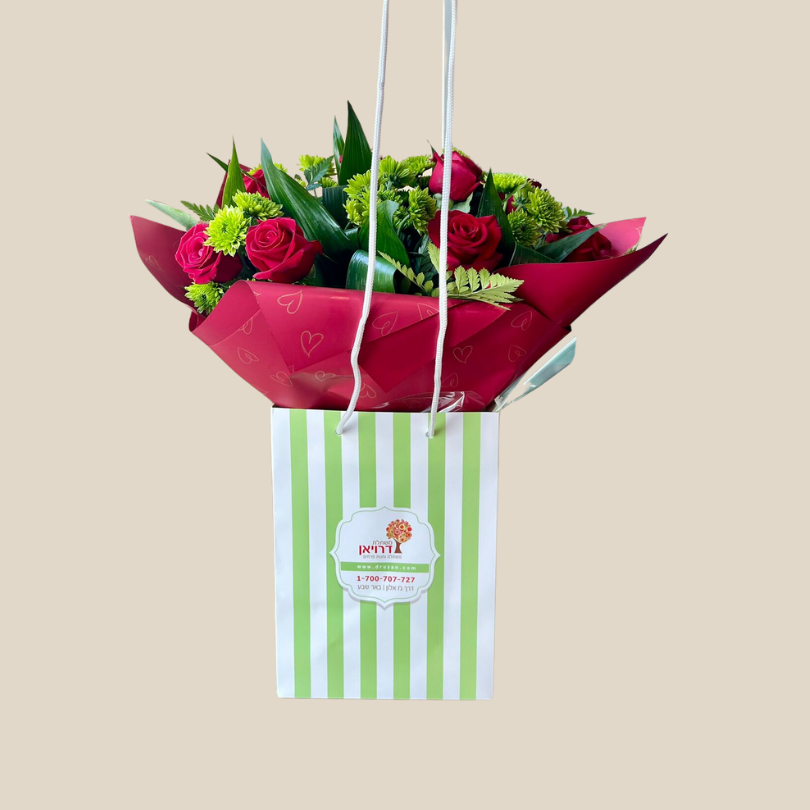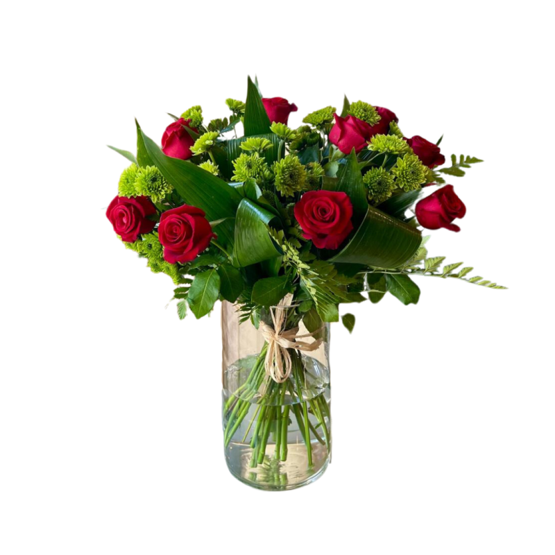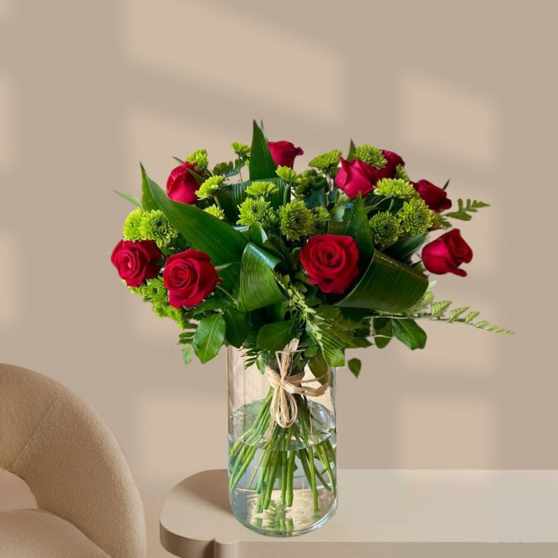 זר רומנטי שמכיל 9 ורדים אדומים בשילוב עם חרציות ירוקות וירק האספדיסטרה.