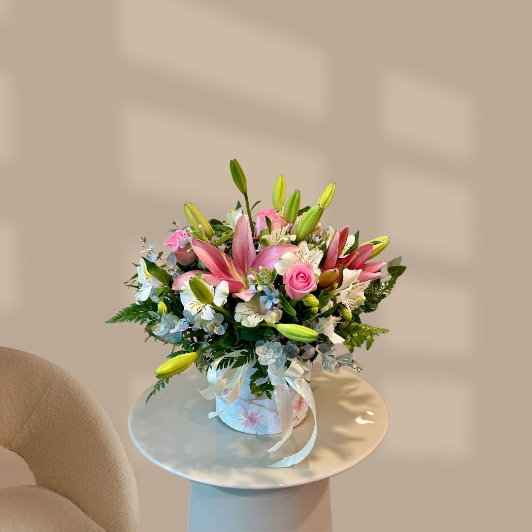 סידור פרחים המעוצב בפרחי ליליות וורדים בתוך קופסאת וינטאג' מרשימה