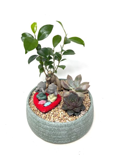 השלווה שאיתך הוא קוקטייל סוקולנטים בתוספת 2 בובות בודהה.