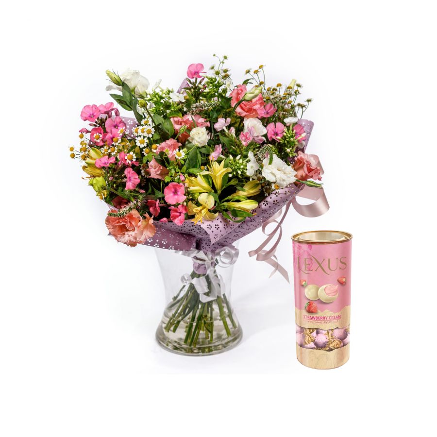 מארז זה כולל זר Summer time עם ואזה ושוקולד איכותי.