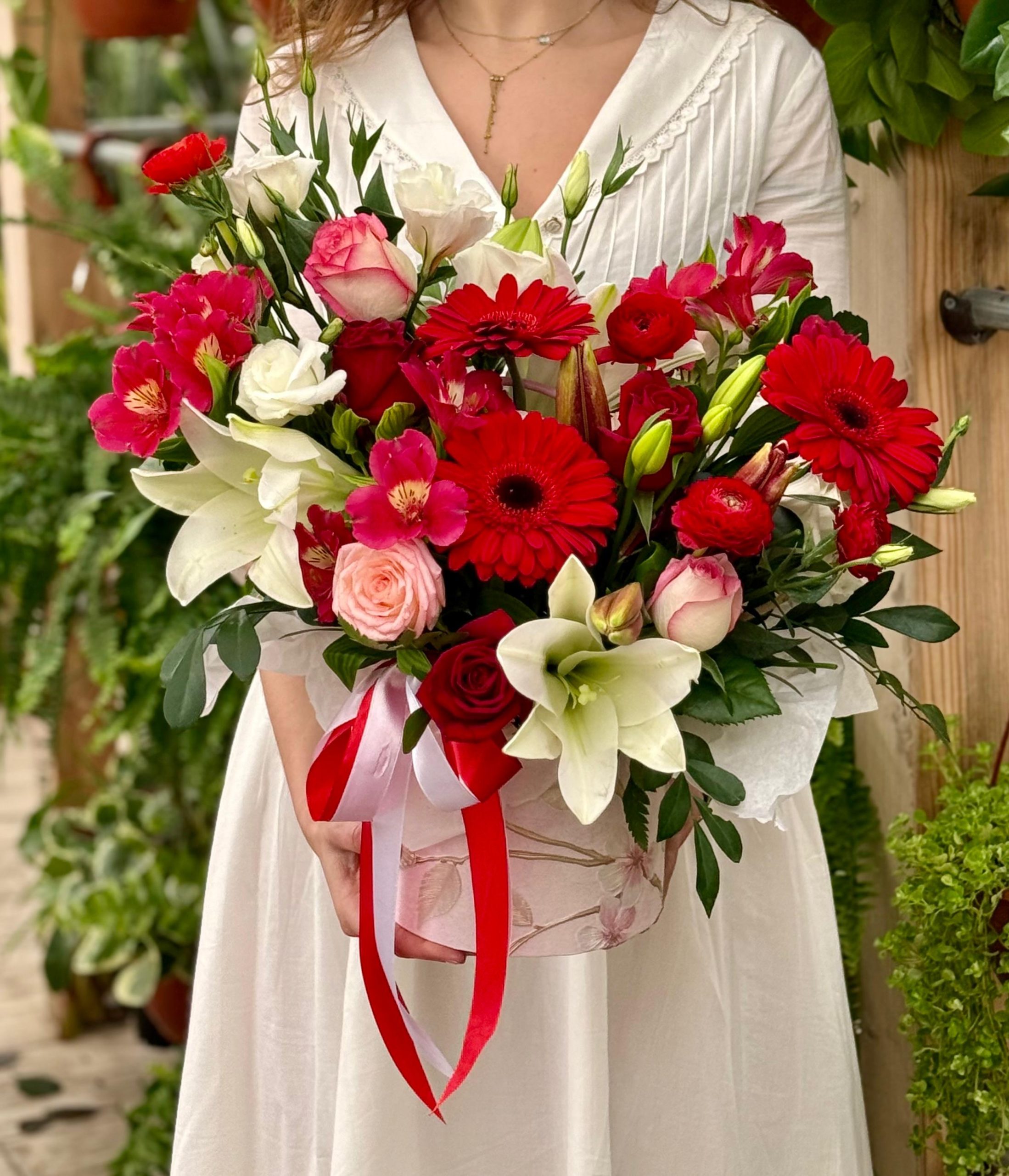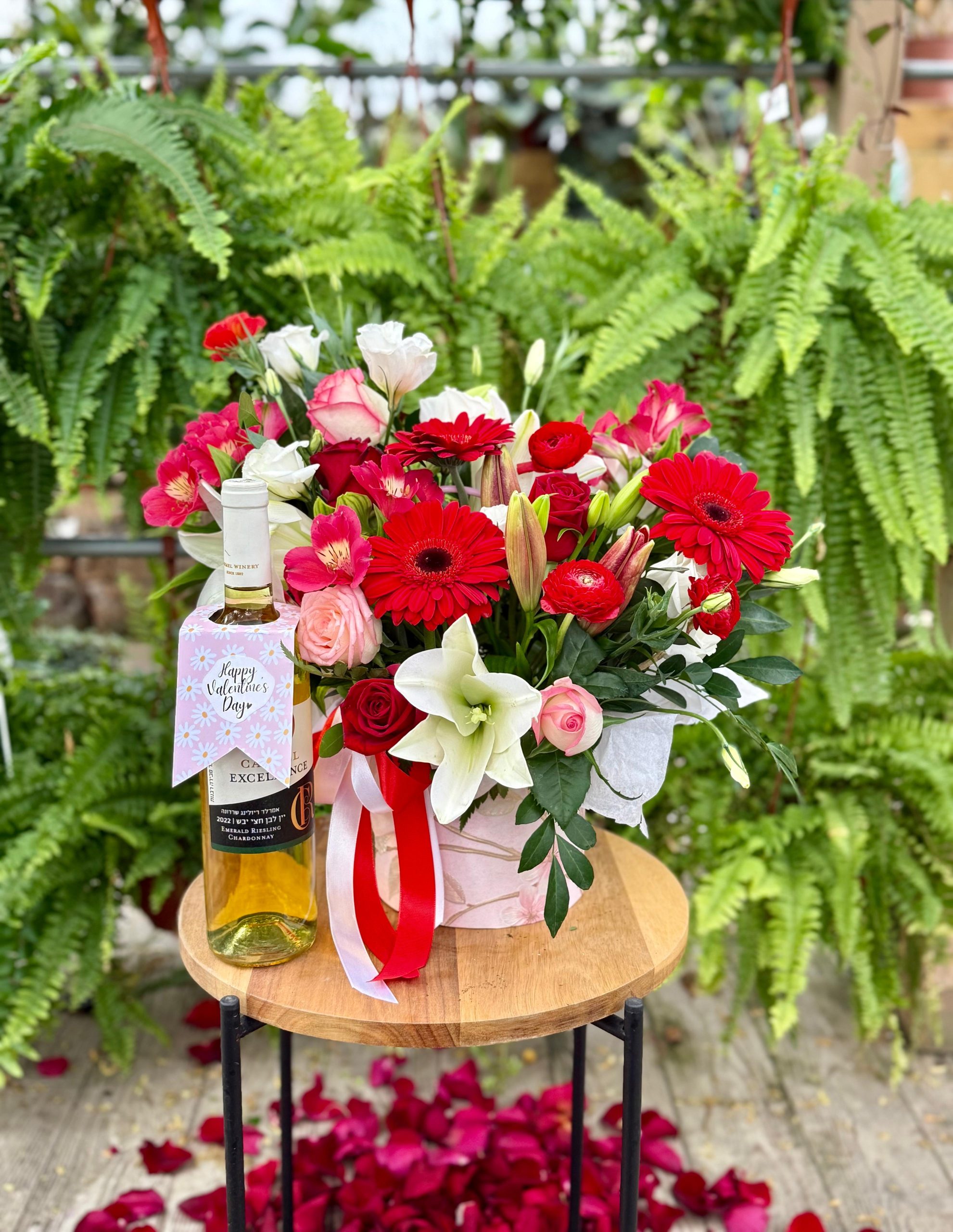 סידור בגווני אדום, ורוד ולבן בתוספת יין. ה-מתנה לוולנטיין!!